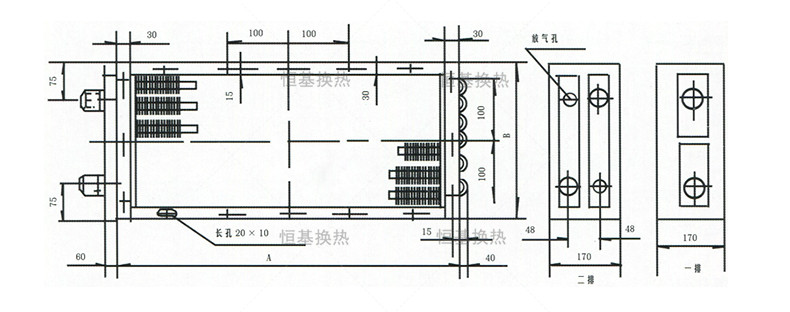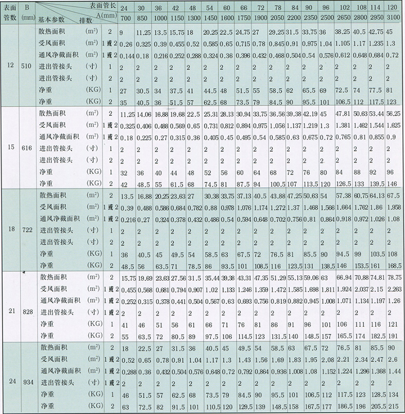 UⅡ型蒸汽散热器有各种不同表面管长、管数(shù)、排(pái)数及翅片(piàn)片距的多种配合,计有大小规格七百六十五种。